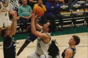 NCAA季前赛,旧金山大学对阵犹他州立大学,旧金山大学前锋王俊杰先发出场,一条龙推进1v2强打进球