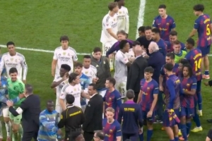 国家德比,皇马在主场2-1击败巴萨。本场比赛堪称火花四溅,要素拉满:赛前放话、红牌、进球、点球、失点、赛后冲突一样不缺。