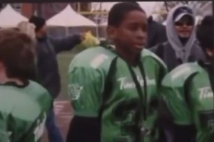 随后主持人拿出了亚历山大小时候打橄榄球的照片(配图)。亚历山大随后说:“(打橄榄球)没门儿、没门儿,我倒在了橄榄球场、被风吹倒了,所以我马上就没打了。”