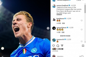 霍伊伦社媒晒出庆祝进球的照片,并发文调侃:“霍伊伦在欧冠比赛中梅开二度,还都是德布劳内的助攻——这完全不在我2025年的剧本之中。”