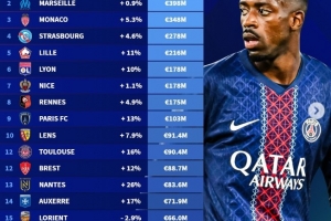法甲俱乐部身价排行:巴黎11.5亿欧断层领先,马赛3.98亿欧次之