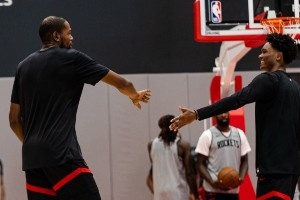 体育资讯10月12日讯 火箭官方更新了球队今天的训练照,多位球员都有出镜,看球衣颜色似乎进行了分组对抗,球员的状态看起来都比较积极。
